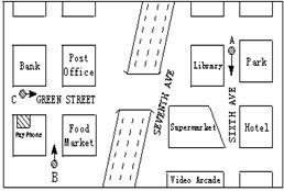 根据下列图示,写一篇短文或一段对话,如果你在A处要到邮局寄信;在B处你要到图书馆看书在C处你要到旅馆去住宿,请你选择其中的一处地方把路线描述出来。(注意:请你把你所描述的路线在图上用箭头的方式标出来。)