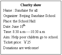 假如你是北京阳光中学的李平,你们学校要举办一次慈善演出。请你根据左面海报提供的信息,给你的朋友Simon发一封e-mail,邀请他参加这次慈善演出。可适当发挥,词数60左右。