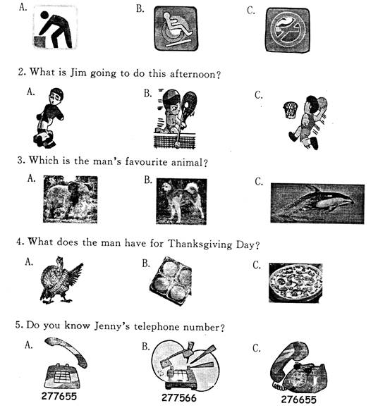 听下面有5段对话,从A、B、C三幅图画中选出符合对话内容的图画,将答案写在答题卷上。