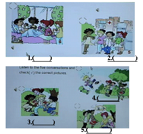 III. 听五个对话,根据对话顺序在图画下面的括号内分别填上A、B、C、D、E五个字母。读二遍(5分)