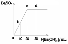 10、.常温下,向0.1 mol·L-1的硫酸溶液中逐滴加入物质的量浓度相同的氢氧化钡溶液,生成沉淀的量与加入氢氧化钡溶液的体积关系如图所示,a、b、c、d分别表示实验时不同阶段的溶液,下列有关说法中不正确的是 ……… ( )