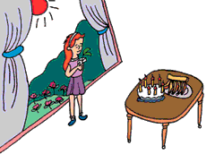There are some bananas (4)________the(5) ________and a birthday cake on the table. On the cake there are some (6) ________. The girl has a box in her (7) ________. She is looking (8) ________it (9) ________a big smile. What is in the (10) ________? Do you know?