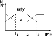 ΔH>0。 从反应开始到t1 s时达到平衡状态,在t2 s时,由于条件变化使平衡破坏,到t3 s时又达平衡,下图表示在上述过程中物质浓度与反应时间的关系,试判断图中引起