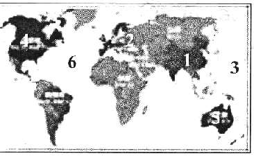 根据世界地图上的标号在方框内找出相应的地域名称(6小题,每小题0.5分,计3分)