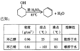 将12.5mL环己醇加入试管A中,再加入lmL浓硫酸,摇匀后放入碎瓷片,缓慢加热至反应完全,在试管C内得到环己烯粗品。