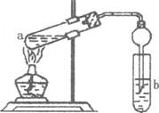 (2)如右图,在试管a中先加入2mL95%的乙醇,边摇动边缓缓加入5mL浓H2S04并充分摇匀,冷却后再加入2g无水醋酸钠,用玻璃棒充分搅拌后将试管固定在铁架台上,在试管b中加入 7mL饱和碳酸钠溶液。连接好装置。用酒精灯对试管a加热,当观察到试管b中有明显现象时停止实验。