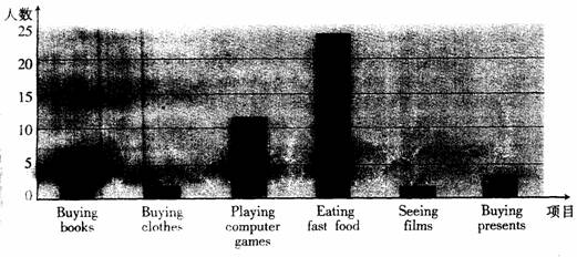 下列图表是对初三(1)班50名同学零花钱(pocket money)支出最多项目的调查结果统计,请用英语写一篇80词左右的短文,简要说明图表内容,发表个人看法,并提出建议。