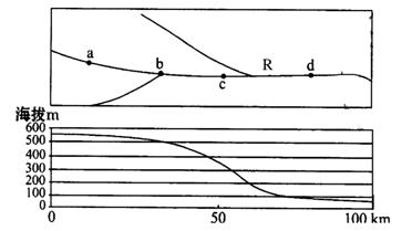 下图为R河流域河流分布图及其干流河床对应的剖面图,读图回答17-18题。