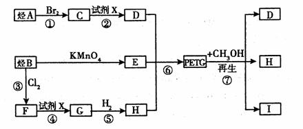 ⑵C分子有多种同分异构体,其中有一种含有羧基,不含甲基的物质甲。该分子能发生多种反应,如能生成五元环状物质乙,也能生成最简式与乙相同的两种聚合物丙和丁。