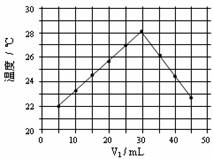 4.将V1mL1.0mol·L-1 HCl溶液和V2mL未知浓度的NaOH溶液混合均匀后测量并记录溶液温度,实验结果如右图所示(实验中始终保持V1+V2=50mL)。下列叙述正确的是( )