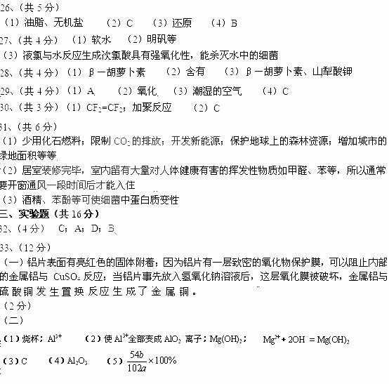 33.(12分)某铝合金中含有镁、铜、硅,为了测定研究它的抗腐蚀性能和测定合金中铝的含量,某研究性学习小组设计了如下实验: