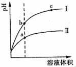 A.II为盐酸稀释时的pH值变化曲线 B.b点溶液的导电性比c点溶液的导电性强 C.a点KW的数值比c点Kw的数值大 D.b点酸的总浓度大于a点酸的总浓度
