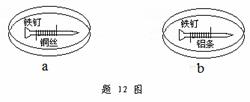 12. 如题12图所示,将紧紧缠绕不同金属的铁钉放入培养皿中,再加入含有适量酚酞和NaCl的琼脂热溶液,冷却后形成琼胶(离子在琼胶内可以移动)。下列叙述正确的是