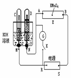 25、(10分)如图所示,E为沾有Na2SO4溶液的滤纸。A,B分别为Pt片,压在滤纸两端,R、S为电池的电极。M、N是用多孔的惰性电极。G为电流计,K为开关。C、D和电解池中都充满浓KOH溶液。若在滤纸中央点上一滴紫色的KMnO4溶液,K打开,接通电源一段时间后,C、D中有气体产生。