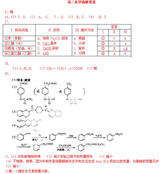 17.( 8分)为进行Ⅰ项中的除杂实验(括号内为杂质),请从Ⅱ项中选出一种试剂,从Ⅲ项中选出一合适的实验操作方法分离,将标号填在后面的答案栏内。