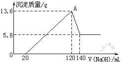 26.(6分)将一定质量的Mg-Al合金投入100 mL一定物质的量浓度的某HCl溶液中,充分反应。向反应后的溶液中逐滴加入一定物质的量浓度的NaOH溶液,生成沉淀的质量与所加NaOH溶液的体积关系如图。计算下列问题:(写出简要计算过程)