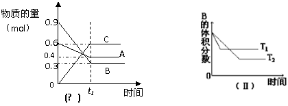 18. T℃时,A气体与B气体反应生成C气体。反应过程中A、B、C物质的量变化如图(Ⅰ)所示;若保持其他条件不变,温度分别为T1和T2时,B的体积分数与时间的关系如图(Ⅱ)所示,则下列结论正确的是( )