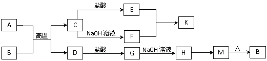 (12分) 下图为中学化学中常见的物质转化关系图,其中A、D为单质,B为红棕色固体,K为白色胶状沉淀,既可以溶于强酸溶液,又可以溶于强碱溶液。框图中部分产物已略去。