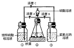 待锥形瓶中的铁屑快反应完时,关闭活塞 ,打开活塞 ,容器②中继续产生的氢气会将 (填①、②或③,后同)容器中的溶液压入 容器,在常温下放置一段时间,混合溶液底部将结晶析出硫酸亚铁铵。