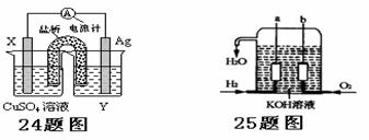 25、(12分)美国阿波罗宇宙飞船上使用的氢氧燃料电池是一种新型的化学电池,其构造如图所示;两个电极均由多孔性碳制成,通入的气体由孔隙中逸出,并在电极表面放电。