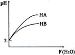 16.pH=2的两酸HA、HB加水稀释后,溶液pH随加水量的变化曲线如右图所示。则下列叙述正确的是 ( )