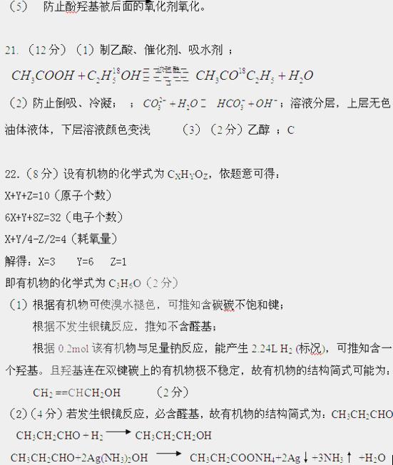 22.(8分)由碳、氢、氧三种元素组成的某有机物,分子中共含有10个原子,其核外共有32个电子,1mol该有机物在氧气中完全燃烧时需要4molO2,回答:
