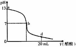 向20 mL氢氧化钠溶液中逐滴加入0.2 mol/L醋酸溶液,滴定曲线如下图所示,下列说法不正确的是: