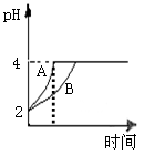 (2)常温下,取pH=2的盐酸和醋酸溶液各100mL,向其中分别加入适量的Zn粒,反应过程中两溶液的pH变化如图所示。则图中表示醋酸溶液中pH变化曲线的是 (填“A”或“B”)。设盐酸中加入的Zn质量为m1, 醋酸溶液中加入的Zn质量为m2。则m1 m2(填“<”、“=”、“>”)