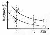 2NO2(g);△H= +57 kJ·mol-1,在温度为T1、T2时,平衡体系中NO2的体积分数随压强变化曲线如图所示。下列说法正确的是: