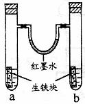 右图装置中,U型管内为红墨水,a、b试管内分别盛有食盐水和醋酸溶液,各加入生铁块,放置一段时间。下列有关描述错误的是( )