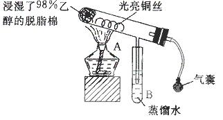 其实验操作为:预先使棉花团浸透乙醇,并照图安装好装置;在铜丝的中间部分加热,片刻后开始(间歇性)鼓入空气,即可观察到明显的实验现象。![]()