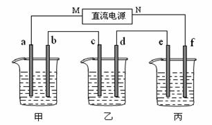 (5)欲在丙烧杯中实现铁的表面镀上一层银,则电解质溶液为 ,e电极的材料是: ,f电极的电极反应式为 。