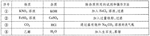下表为各物质中所含有的少量杂质,以及除去这些杂质所用的试剂和操作方法。正确的一组为