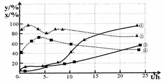 (2)120℃,在相同条件的密闭容器中,分别进行H2的初始浓度为2 mol·L一1和4 mol·L-1的实验,测得反应消耗CCl4的百分率(x%)和生成物中CHCl3,的百分含量(y%)随时间(t)的变化关系如下图(图中实线是消耗CCl4的百分率变化曲线,虚线是产物中CHCl3的百分含量变化曲线)。在图中的四条线中,表示H2起始浓度为2mol·L一1实验的消耗CCl4的百分率变化曲线是