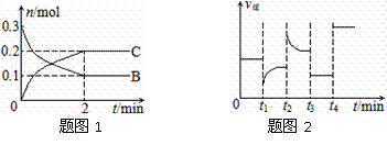 △H<0,反应过程中B、C的物质的量随时间变化的关系如图1;反应达平衡后在t1、t2、t3、t4时分别都只改变了一种条件,逆反应速率随时间变化的关系如图2。下列有关说法正确的是