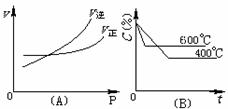 图中C%表示某反应物在体系中的百分含量,v表示反应速度,P表示压强,t表示反应时间。图(A)为温度一定时压强与反应速度的关系曲线;图(B)为压强一定时,在不同时间C%与温度的关系曲线。同时符合以下两个图像的反应是