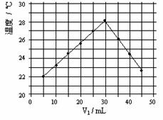 将V1mL1.0mol/L HCl溶液和V2mL未知浓度的NaOH 溶液混合均匀后测量并记录溶液温度,实验结果如右图所示(实验中始终保持V1+V2=50mL)。下列叙述正确的是