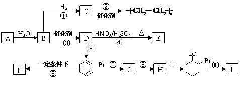 22. (27分) 已知A为固态物质,实验室利用A与水反应制备气态物质B;F遇到FeCl3溶液显紫色;I 属于二元醇.各物质间的转化关系如下图所示: