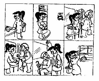 画中女孩杨梅吃过早饭,准备去看电影,上车后一位老奶奶上车,她赶紧让位,…请你用英语以第一人称的口吻写一篇短文,叙述一下6 幅图的内容。![]()