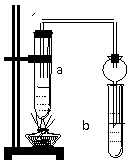 (共8分)如右图所示,在试管a中先加2mL乙醇,边摇动边缓缓加入5mL浓硫酸,摇匀冷却后,再加入2g无水醋酸钠,充分搅动后,固定在铁架台上。在试管b中加入适量的饱和Na2CO3溶液。连接好装置,给a加热,当观察到试管b中有明显现象时,停止实验。