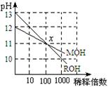 MOH和ROH两种一元碱的溶液分别加水稀释时,pH变化如右图所示。下列叙述中不正确的是