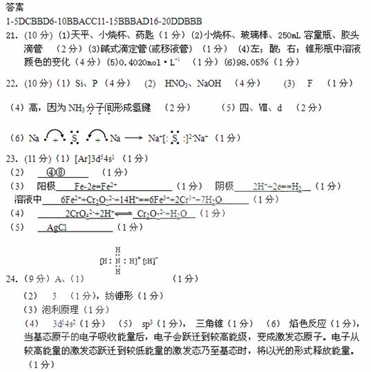 24、(9分)现有七种元素,其中A、B、C、D、E为短周期主族元素,F、G为第四周期元素,它们的原子序数依次增大。请根据下列相关信息,回答问题。