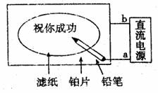 某学生设计了一个“黑笔写红字’’的趣味实验,如图所示.滤纸先用氯化钠、无色酚酞的混合液浸湿,然后平铺在一块铂片上,接通电源后,用铅笔在滤纸上写字,会出现红色字迹.据此,下列叙述正确的是 ( )
