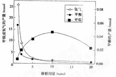 反应结束后,气体中检测到CH4和H2,滤液中检测到HCOOH(甲酸),固体中检测到镍粉和Fe3O4。CH4、HCOOH、H2的产量和镍粉用量的关系如图所示(仅改变镍粉用量,其他条件不变):