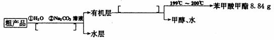在园底烧瓶中加人12.2g 苯甲酸和20 mL 甲醇(密度约0.80g · mL-1) ,再小心加人3 mL 浓硫酸,混匀后,投人几粒碎瓷片,小心加热使反应完全,得苯甲酸甲酯粗产品。