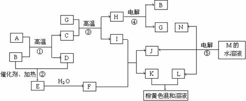 23、(10分)根据反应框图填空,已知反应①-⑤均为工业生产及应用中常见反应,其中B、G、I、J、L均为常见单质,B、D、J、L为气体。A是工业生产F的重要矿石原料的主要成份,其相对分子质量为120。