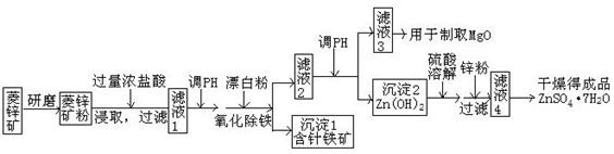 24.(13分) 硫酸锌可作为食品锌强化剂的原料。工业上常用菱锌矿生产硫酸锌,菱锌矿的主要成分是ZnCO3,并含少量的Fe2O3 、FeCO3 MgO、CaO等,生产工艺流程示意如下: