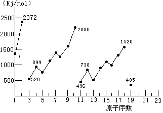 22、不同元素的气态原子失去最外层一个电子所需要的能量(设其为E)如右图所示。试根据元素在周期表中的位置,分析图中吗线的变化特点,并回答下列问题。