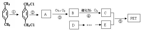 有人以石油产品对二甲苯和最简单的烯烃D为原料,设计合成PET的工业生产流程如下图所示(反应中部分无机反应物及产物未列出)。