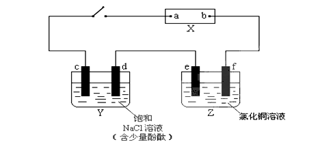 25、(11分).右图中X是直流电源。Y槽中c、d为石墨棒,Z槽中e、f是质量相同的铜棒。接通电路后,发现d附近显红色。